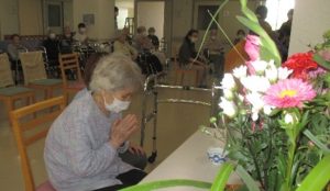 和尚様の法話をお聞きた後、利用者の方お一人ずつ前に出て水揚げをし、手を合わせます。真剣な表情や昔を懐かしむ様子もあり、思い思いにご焼香されていました。ご焼香の後も線香の香りと読経が響き渡り最後まで聴いている方や手を合わせ続ける方もおり、厳かな雰囲気の中にゆったりとした時間が流れていました。他部門からも多くの方が参加し、「このような機会があってよかった。」との声も聞かれ、素敵なひとときを過ごせたのではないかと思います。