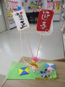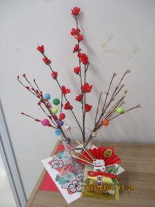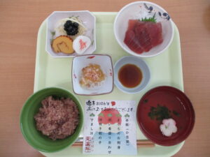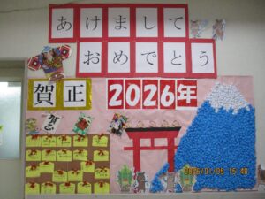 明けましておめでとうございます! 2026年01月05日(月) 明けましておめでとうございます。 新年を迎えたかけはしの様子をお伝えします。 こちらはデイケアの壁画です。絵馬には利用者様の願いごとが書かれています。 他にも、施設内には新年を祝う華やかな装飾が見られます。 元日の行事食です。赤飯や刺身など、お正月らしい献立はとても好評でした。 本年もかけはしでは利用者様やご家族の皆様、地域の皆様とのつながりを大切にしていきたいと考えております。どうぞよろしくお願いいたします。