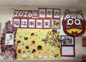2月3日の節分行事に合わせて今年の福方位を貼り出したり、鬼のお面を飾ったりしました。